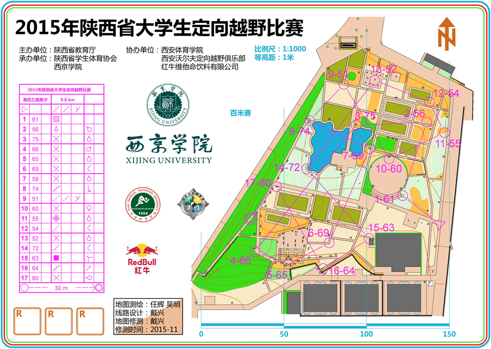 2015年11月20日至21日,由陕西教育厅主办、陕西省学生体育协会和西京学院承办、西安体育学院和西安沃尔夫定向越野俱乐部协办的2015陕西省大学生定向越野比赛在西京学院隆重举行,来自省内的21支高校代表队参加了本次比赛。比赛设置了百米定向混合接力赛、短距离定向赛、百米定向赛和团队定向赛四个单项奖项和团体奖项等。