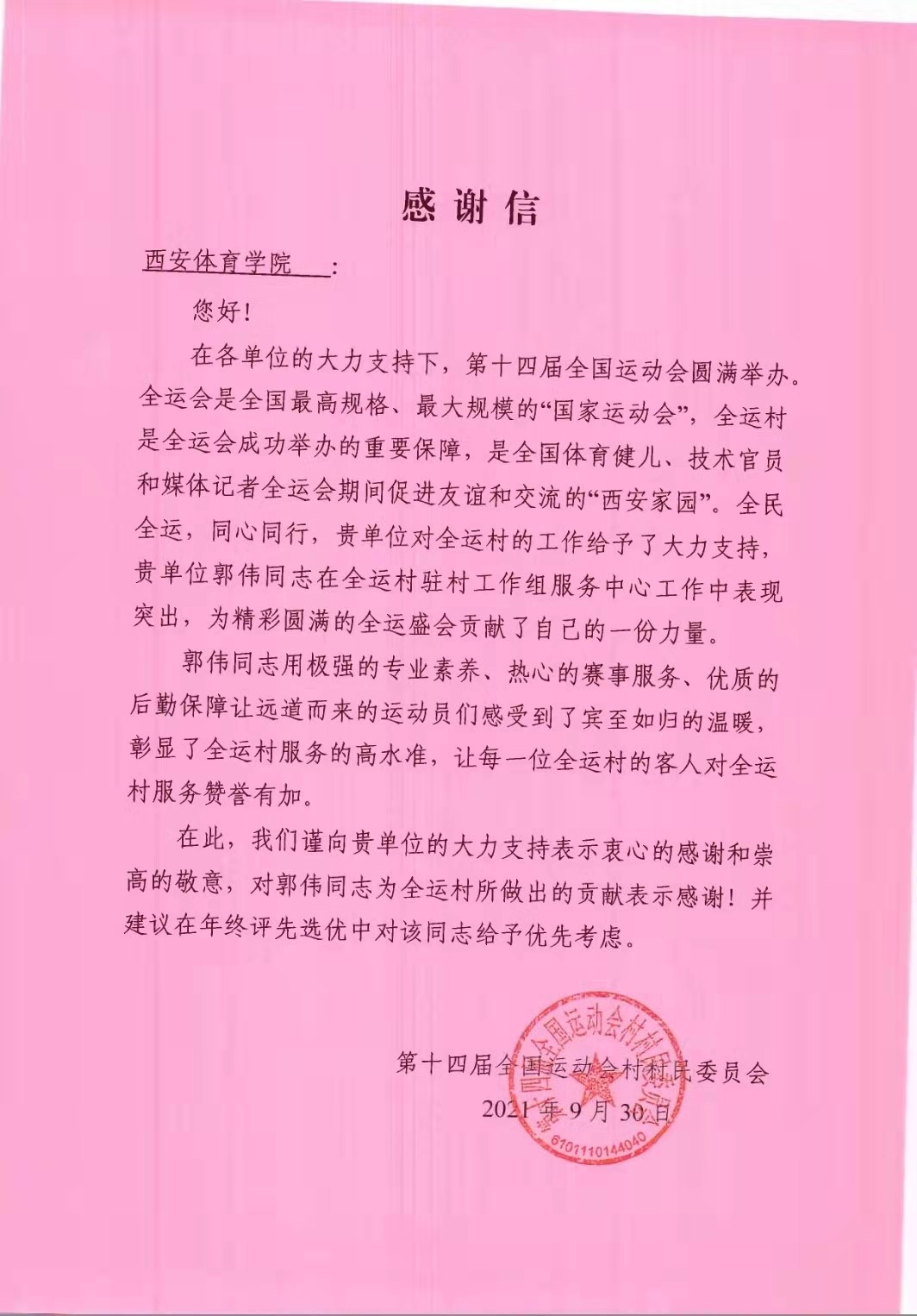 全民全运,同心同行,青春有我,爱在艺院。中华人民共和国第十四届运动会圆满落幕,艺术学院共350余名师生共同参与了本届全运会。其中裁判员7名,教练员1人,运动员5人,各项目工作人员32人,开闭幕式节目演出中260人、志愿者25人,颁奖礼仪22人。充分体现了以体艺相结合,表演、教学、训练、社会服务特色鲜明的特色型学院。