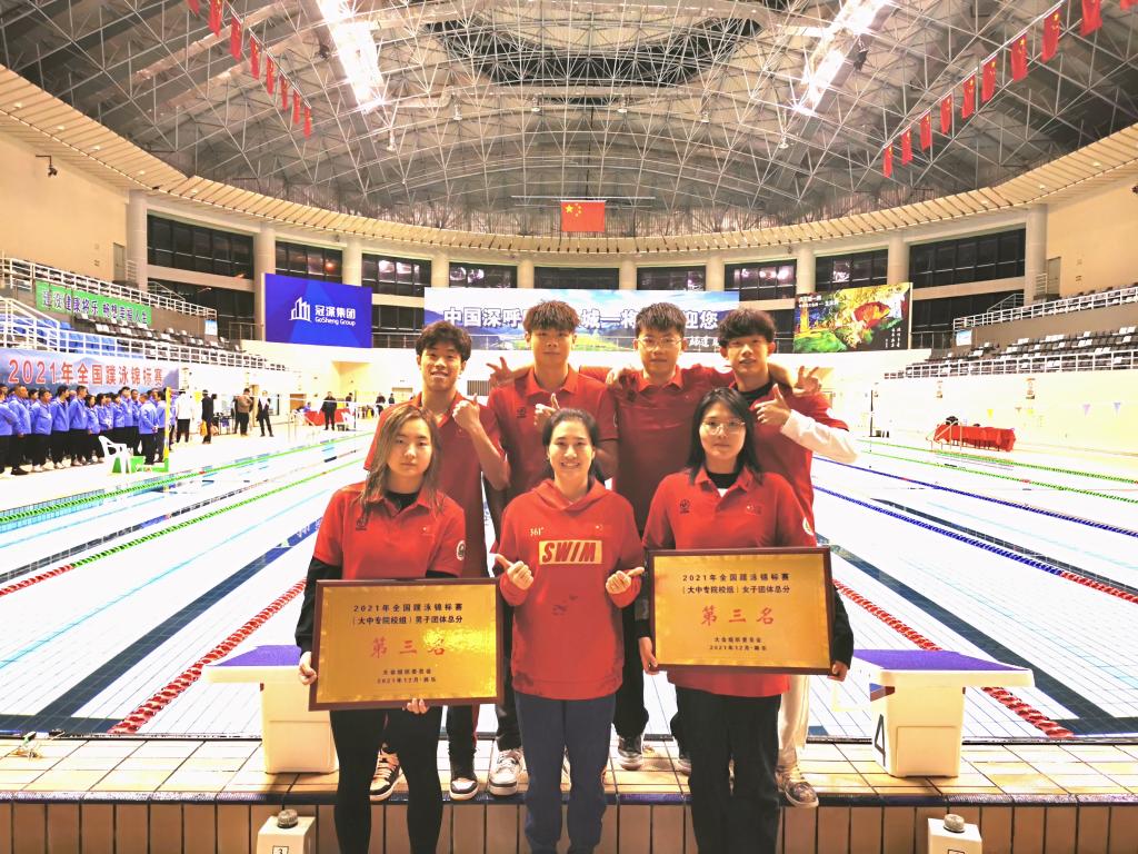 经过3天的激烈角逐,我校体育教育学院游泳教研室殷剑侠老师带领的西安体育学院代表队,共有6名同学(来自运动训练学院的舒炀、文栎、耿雨博、徐龙源、王俞萱、李东海)在院校组的比赛中共斩获五项冠军、六项亚军、三项季军,同时分别获得男女团体总分前三的优异成绩!我校代表队依然展现出了永不言弃、顽强拼搏的体育精神!