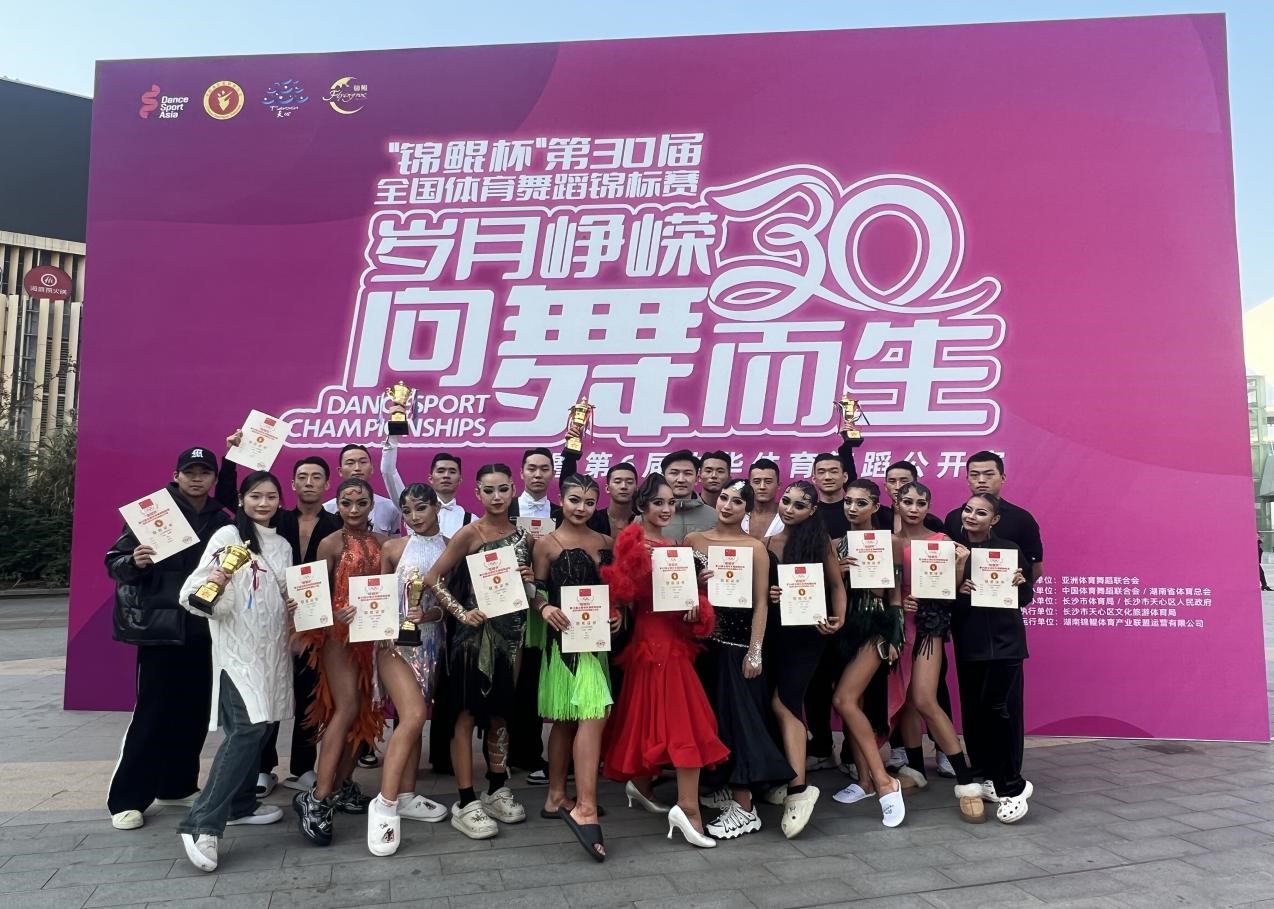 我校艺术学院体育舞蹈队学生21级,22级,23级本科生共计22人,在领队许伟和教练员刘伟校,方鑫,候梦倩的带领下,代表我校参加此次比赛,经过长达的四天激烈角逐,荣获四项冠军,一项亚军,一项季军,两项第四名,两项第五名的优异成绩。