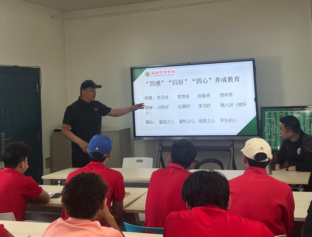 五月的西安体育学院体阳光灿烂,在学院百日奋战、十大鏖战如火如荼的奋战中,西体院足球代表队也开始了新的集结与征途,5月10中午12:30院足球男子代表队在足球教研室开展了“训风建设、训练提升”会议,西体院竞训处副处长边伟、足球学院书记吕学宏、院长席海龍参加了会议并给院足球队全体教练、队员提出新的目标、要求、新的学风和训风的讲话、期盼与祝福。