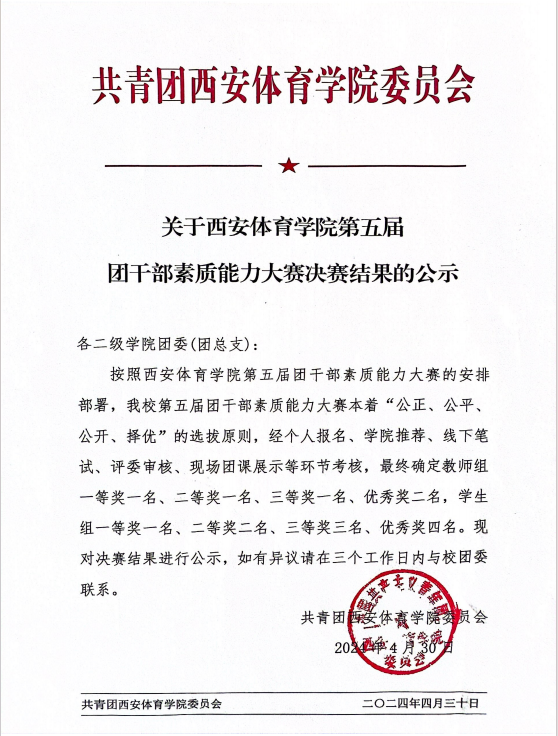 关于西安体育学院第五届团干部素质能力大赛决赛结果的公示