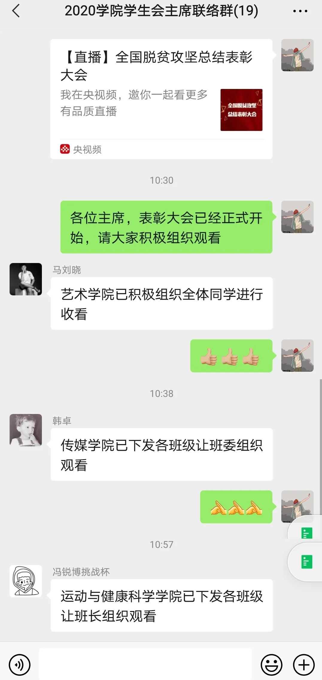 与此同时,我校上千名学子共同观看了全国脱贫攻坚总结表彰大会直播,一起见证这彪炳史册的历史瞬间。习近平总书记在全国脱贫攻坚总结表彰大会上的重要讲话精神让人为之一振,使得广大学子坚定信念、一往无前。