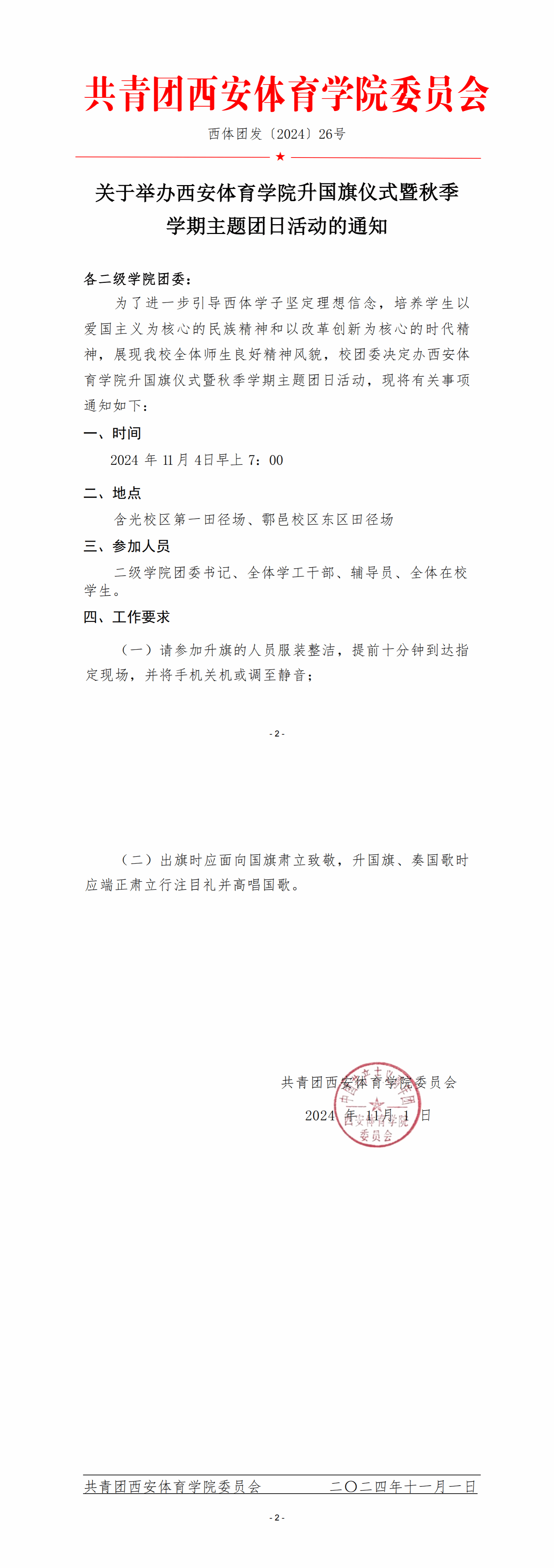 关于举办西安体育学院升国旗仪式暨秋季 学期主题团日活动的通知