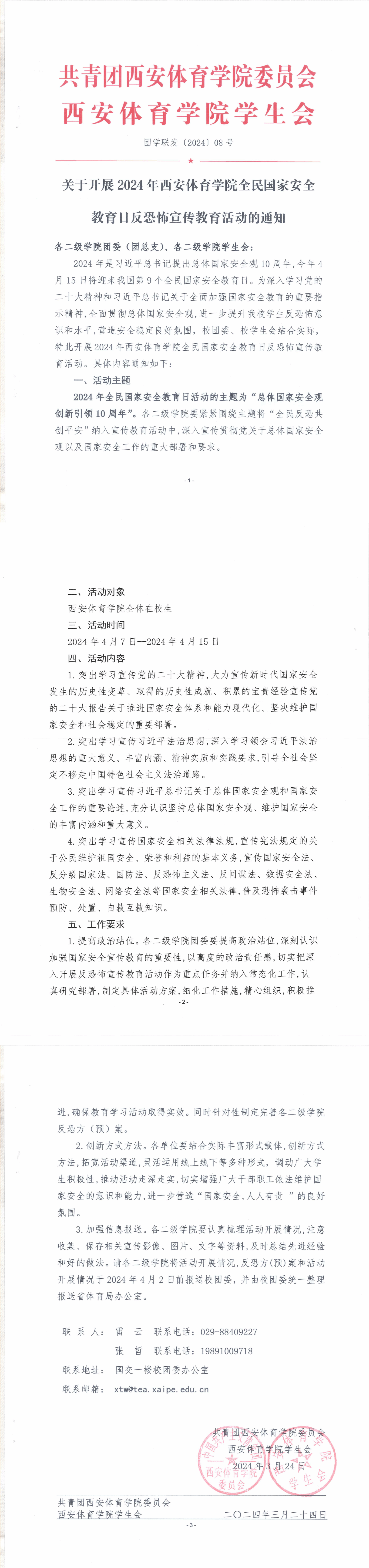 关于开展2024年西安体育学院全民国家安全 教育日反恐怖宣传教育活动的通知
