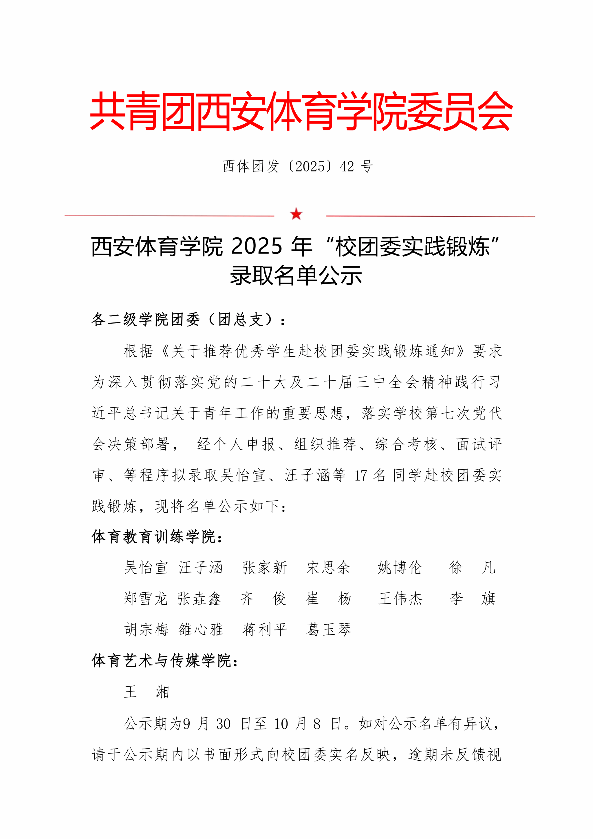 西安体育学院2025年“校团委实践锻炼”录取名单公示