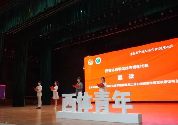 西安体育学院优秀青年代表张雅琪、冯汝真、杜柯瑶、郝俊铭宣读《优秀青年代表向西安体育学院青年发出助力高质量发展宣读倡议书》。