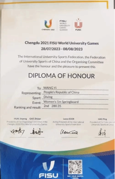 2023年8月1日,在成都第31届世界大学生夏季运动会举行跳水项目女子1米跳板决赛中,陕西跳水新秀、我校2020级学生王壹以280.35分摘得银牌。