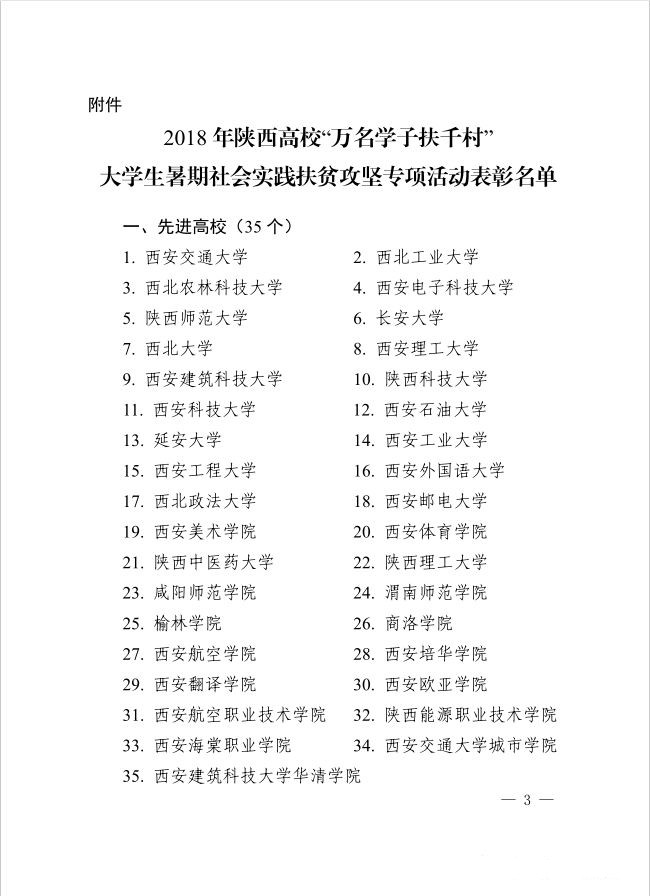 近日,中共陕西省委教育工委、共青团陕西省委下发了关于表彰2018 年陕西高校“万名学子扶千村”大学生暑期社会实践扶贫攻坚专项活动先进集体和个人的通报。为表彰活动中的先进集体和个人,鼓励更多大学生投身社会实践和扶贫攻坚工作,在各高校评选表彰的基础上,经研究决定对西安交通大学等 35 所“先进高校”、梁辉等 35 名“优秀指导教师”、西安交通大学“梧桐希路”等223 个优秀团队予以通报表彰。