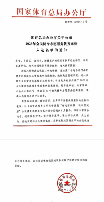 2023年9月,国家体育总局印发《关于开展2023年全民健身志愿服务优秀案例征集活动的通知》,各地各单位积极响应,报送了一批扎根基层、服务群众的全民健身志愿服务案例。经申报审核、专家评审、社会公示等环节,最终遴选出50个工作成效好、示范作用强的优秀案例。其中我校报送的“特教志愿者服务队助残志愿服务活动”获得全民健身志愿服务优秀案例。
