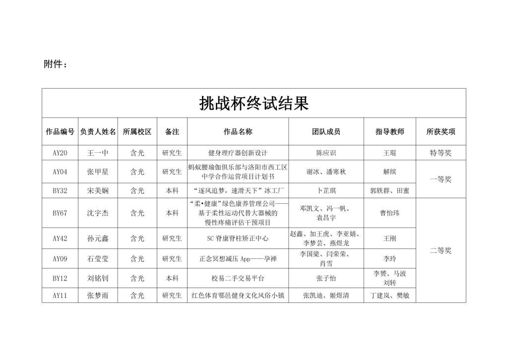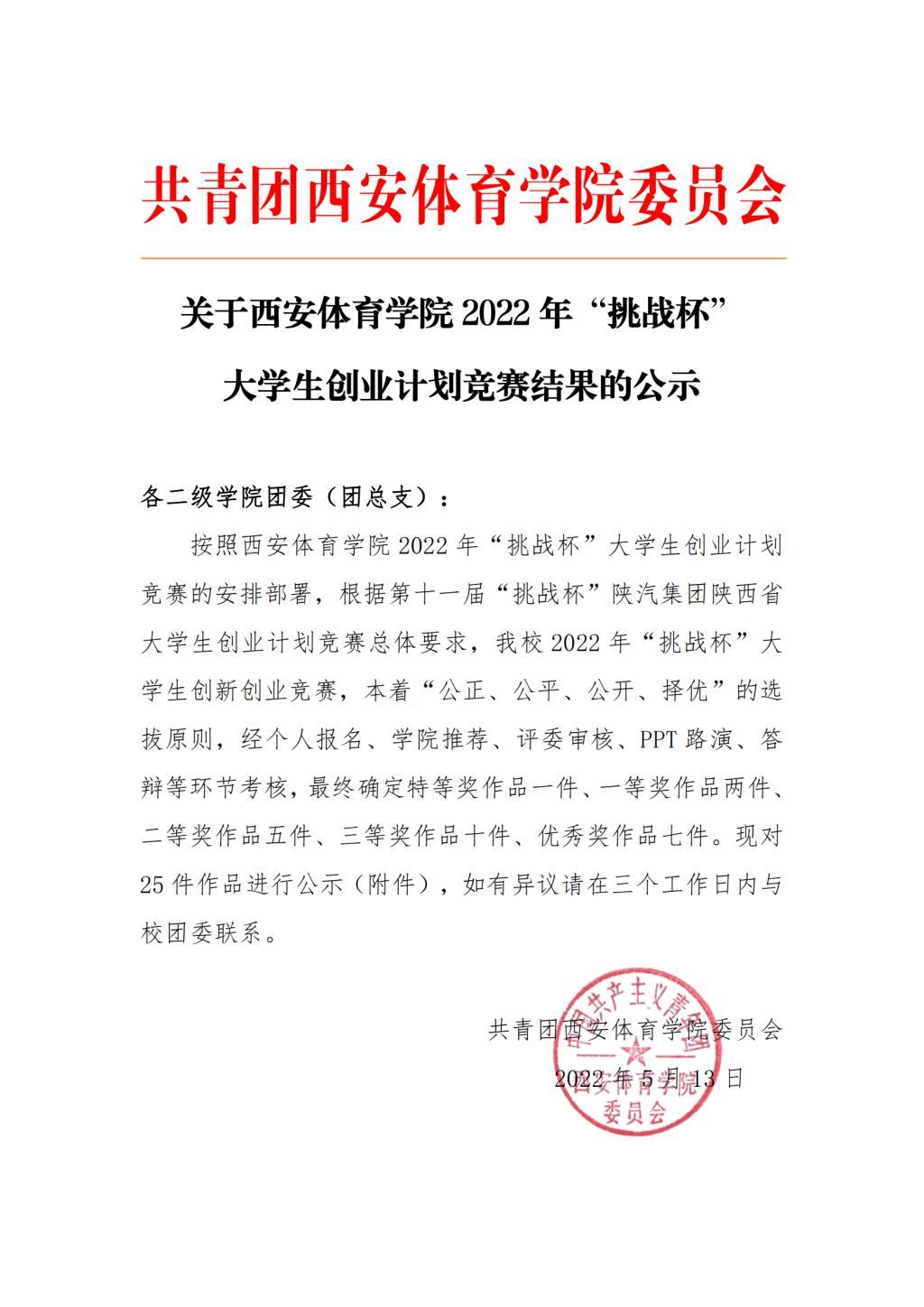 关于西安体育学院2022年“挑战杯” 大学生创业计划竞赛结果的公示