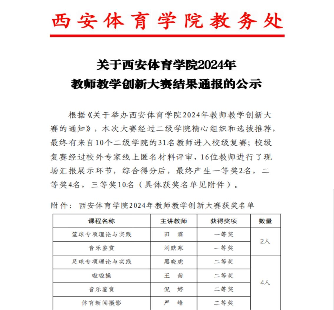 7月11日,2024年度西安体育学院教师教学创新大赛圆满落下帷幕。在经过各二级学院院赛选拔和校外专家匿名评审环节后,最终有16名教师入围校级决赛。音乐教研室刘默寒老师一等奖倪婷老师荣获二等奖。