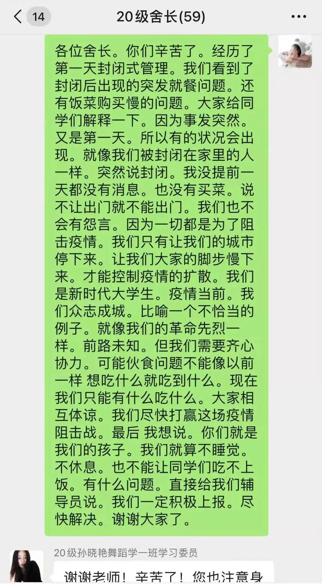 辅导员赵静雯、兼职辅导员车栋老师亲力亲为,解决同学宿舍封闭期间的问题,管控同学们进出宿舍采购确保学生安全,老师们用心用情,确保关心关怀到位。密切关注学生的生活需求,尽一切可能提供帮助。