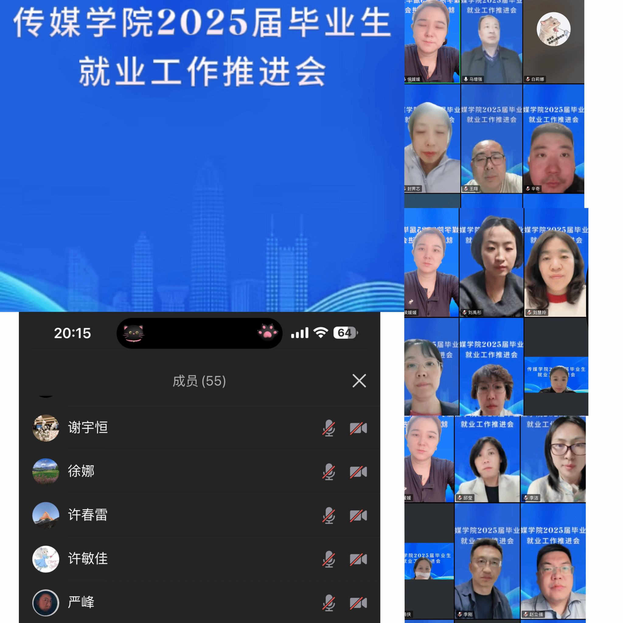 为深入贯彻落实国家关于高校毕业生就业工作的重要部署,扎实推进2025届毕业生高质量就业,体育新闻与传媒学院于3月21日晚在腾讯会议线上召开2025届毕业生就业工作推进会。学院党委书记马增强、副院长(主持工作)王翔、副院长姚静、2025届毕业生辅导员辛奇出席会议并讲话,学院全体教职工共55人参会。