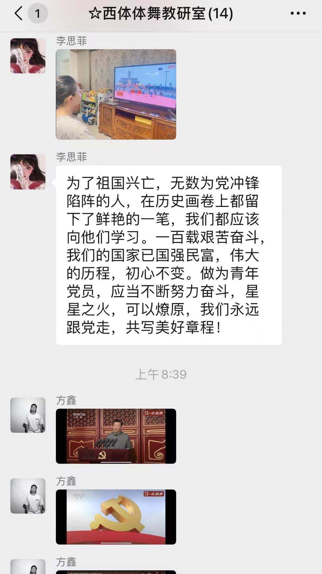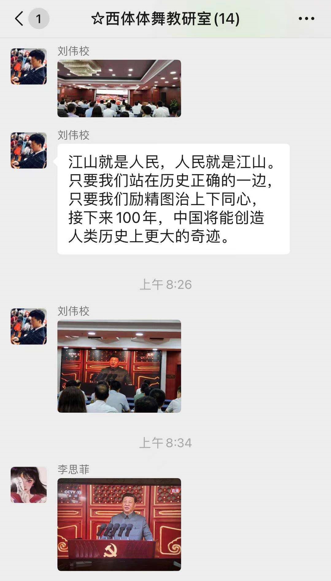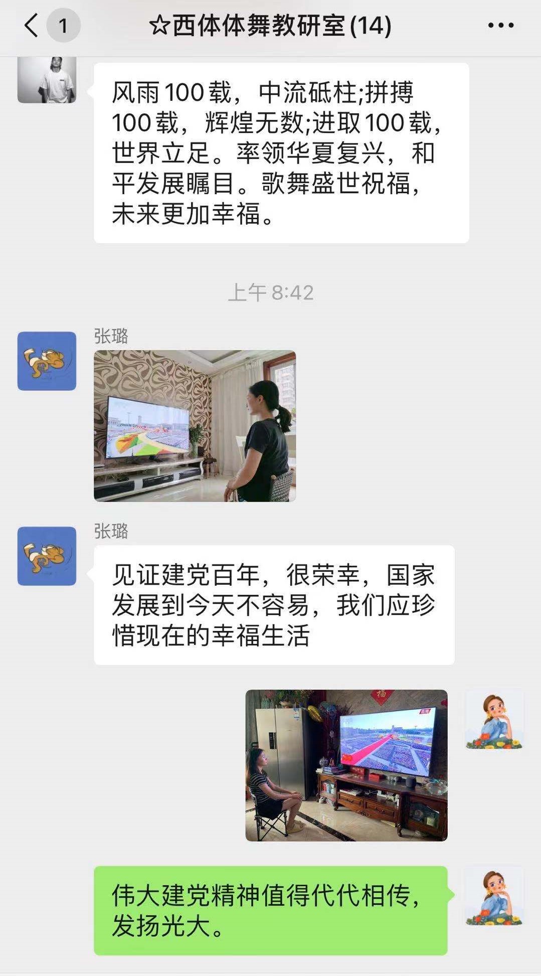 舞蹈教研室党支部书记李晓梅:以史为鉴, 必须坚持中国共产党的领导, 团结中华人民共和国全体人民,开创未来,走向伟大复兴!今天,中国共产党已经发展成为一个走过百年光辉历程、在最大的社会主义国家执政70多年、拥有9100多万党员的世界上最大的马克思主义执政党,得到了14亿中国人民最广泛的支持和拥护。中国共产党立志于中华民族千秋伟业,百年恰是风华正茂!我们要认真回顾走过的路,不能忘记来时的路,继续走好前行的路,坚定理想信念,牢记初心使命,植根人民群众,始终保持蓬勃朝气、昂扬斗志。只要我们党始终站在时代潮流最前列、站在攻坚克难最前沿、站在最广大人民之中,就必将永远立于不败之地。