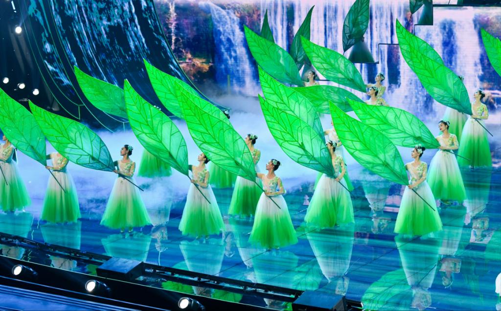 在第二篇章《绿水青山》中,我院的姑娘们手持绿叶道具,在宛转悠扬的歌声中翩翩起舞,寓意表现金碧青绿的和谐生态以及“绿水青山就是金山银山,人与自然和谐发展”的环保理念。