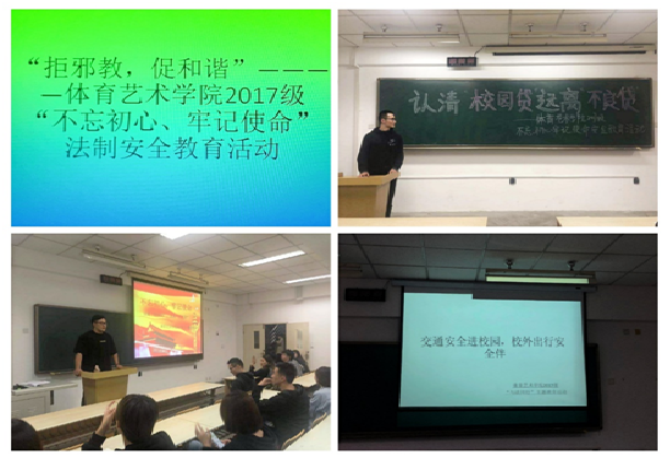 为贯彻落实我校“平安校园”创建工作,积极开展法制教育安全月学生教育,结合“不忘初心,牢记使命”主题活动内容,体育艺术学院2017级在广泛动员的基础上,于近日组织观看了“拒邪教,促和谐”、“交通安全进校园”、“认清校园贷”等法制安全教育宣传片。