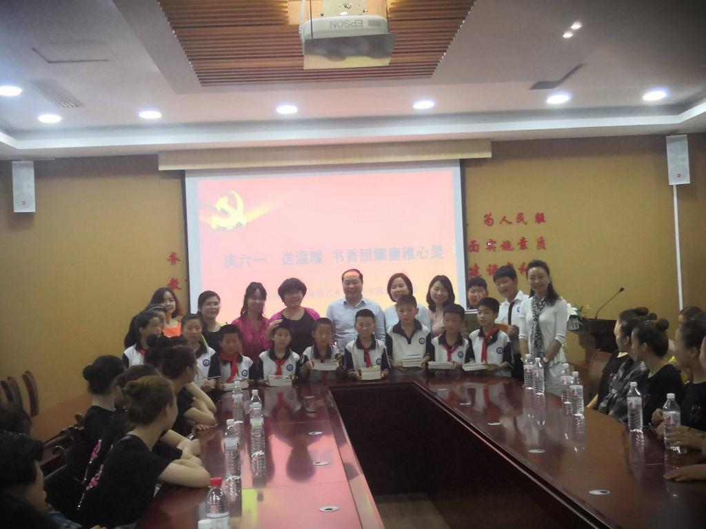 演出结束后,我系60余名师生与滨河荣华实验小学的领导和师生代表进行了以“庆六一 送温暖 书香照耀童稚心灵”的主题座谈交流会,会上为12名建档立卡的孩子们赠送了中国四大名著、世界名著等课外书籍,向孩子们致以节日的问候。同时希望孩子们能够养成良好的读书习惯,爱上读书,做一名有灵气、有书卷气、有浩然正气的优秀中国好儿童,成长为祖国建设事业的接班人。