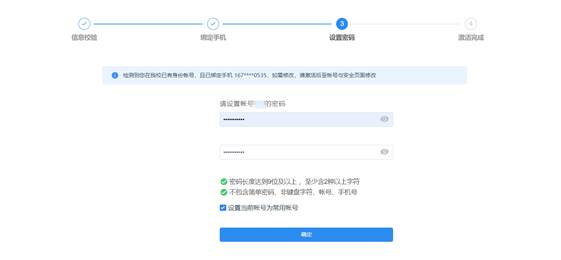 第三步:需要用户设置密码,同时系统将按照内置的密码复杂度规则对用户密码进行校验,若密码复杂度不符合规则,则不允许用户提交。(注:除了系统界面提示的密码规则外,包含姓名拼音、缩写等形式的密码也是不符合要求的。)