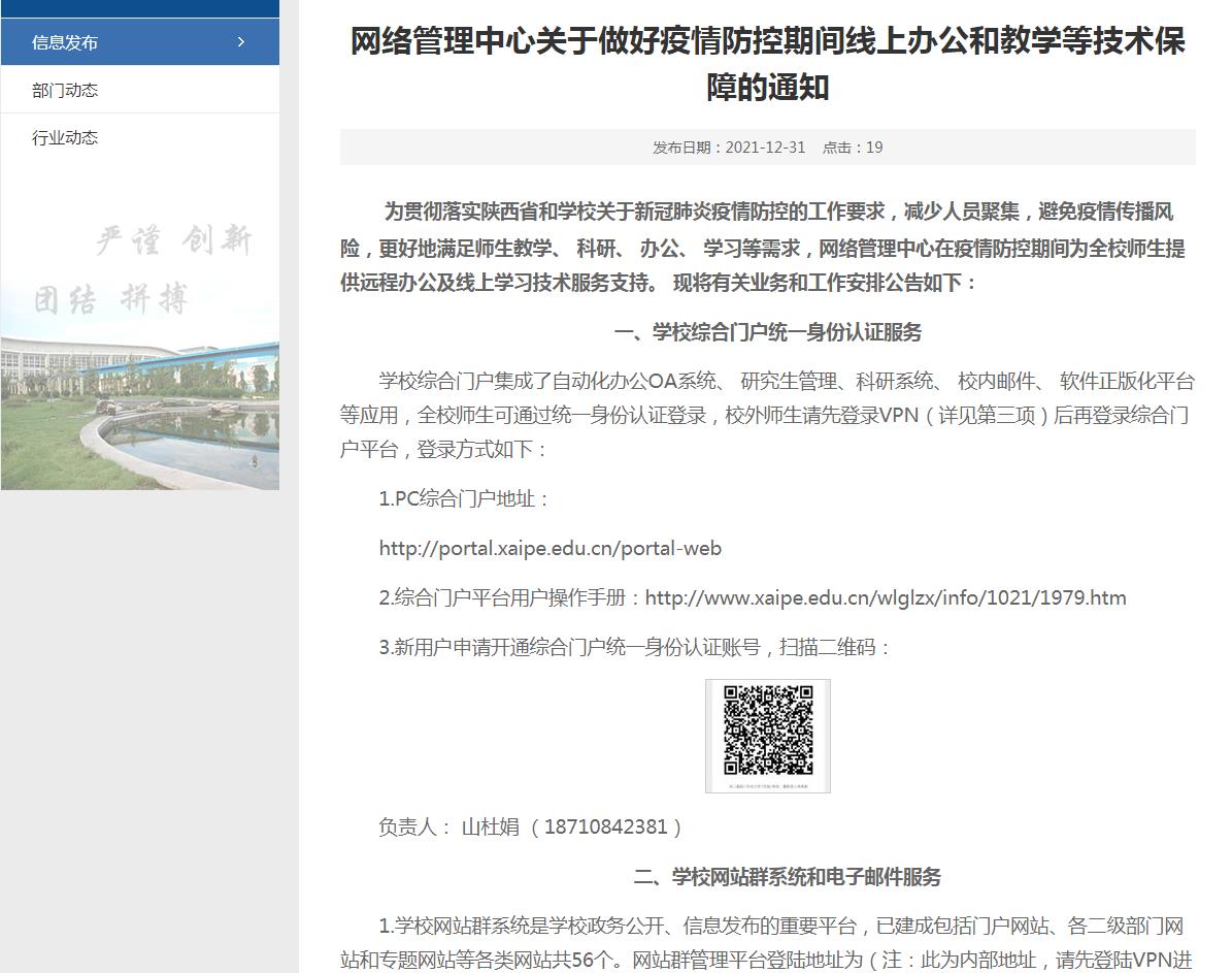 网络保障不同于其他工作,很多时候我们的工作都在幕后不为人知,为了让全校师生教职工能够在防控期间安心的在校园网上处理教学、办公事务,我们加班加点完成学校网站群系统的年度巡检,确保学校门户网站、各二级部门网站和专题网站可以稳定运行,同时发布了《关于做好疫情防控期间线上办公和教学等技术保障的通知》,为全校师生持续提供在线技术服务支持。