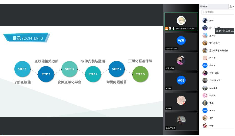 此次培训会邀请到软件正版化专业工程师,向参会人员介绍了软件正版化工作的重要性及相关政策,讲解了学校软件正版化平台的功能及使用方法,最后对Windows系列操作系统、Office办公软件的下载、安装及激活方法进行演示,并在线答疑。