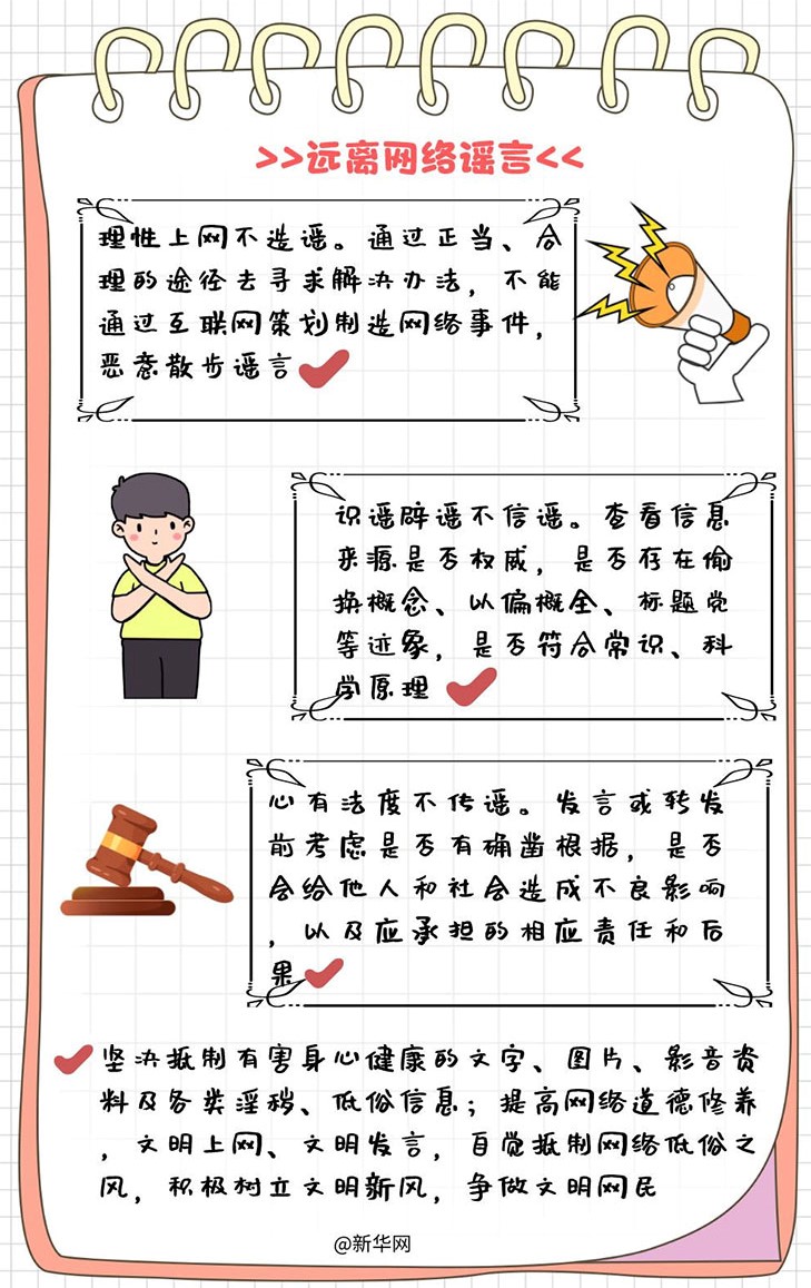 四、远离网络谣言,不造谣、不信谣、不传谣。自觉抵制网络上不法分子的恶意引导和蛊惑,学会独立思考和理性判断;自觉抵制并积极举报各种标题党,以偏概全,偷换概念,煽动网民情绪,制造性别、人群和地域对立的信息;提高网络道德修养,文明上网,文明发言,自觉抵制有害身心健康的文字、图片、音频和视频信息。
