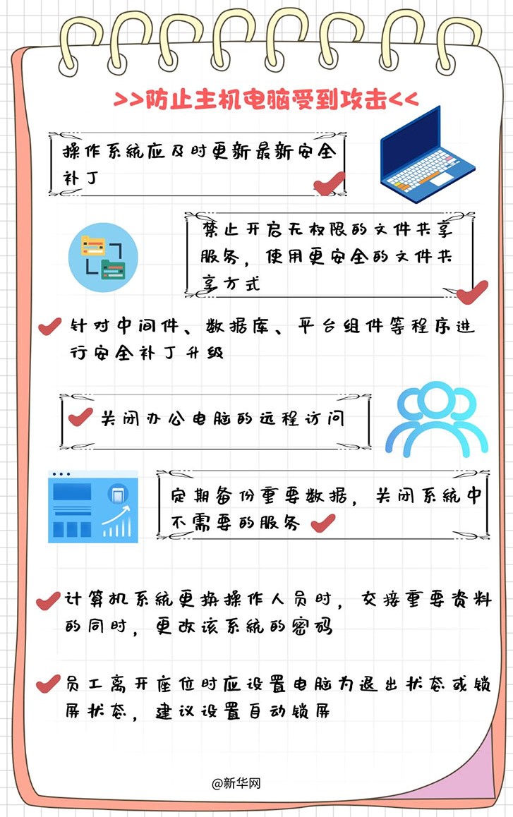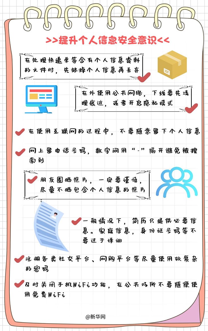 一、提升个人信息安全意识,保护好自己姓名、身份证号、电话号码、家庭住址、网上银行账户、社交账户、移动支付账户、通讯录、个人及亲友的照片和视频等重要隐私信息,防止个人信息泄露。