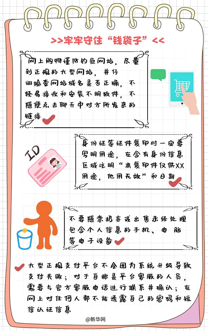 三、保护移动支付安全,守护好自己的“电子钱包”。网上购物要选择正规的大型网站,不随便点击来路不明的网上购物链接;不要随意丢弃保存有个人银行账户信息的旧手机和旧电脑,废弃手机和电脑设备要及时卸载各种金融类软件和APP并将存储格式化;对于自称是银行或移动支付平台工作人员的来电和短信,要仔细甄别并与官方确认,不向任何陌生人透露自己的密码和短信验证码。