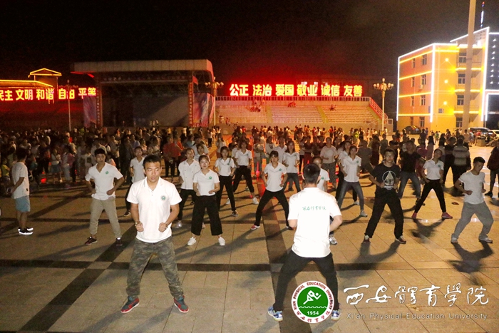 在延安市黄陵县的文体广场上,同学们向在场群众发放健康知识宣传手册,来自学院健康科学系的两位志愿者带领群众练习传统养生八段锦,用自身掌握的专业知识为人民服务。