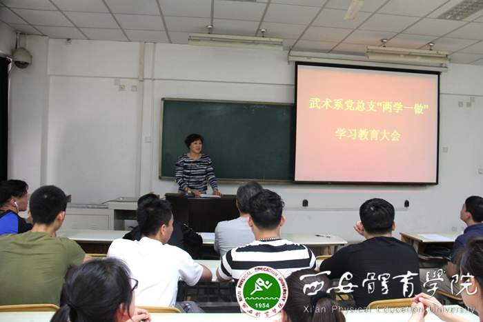 本网讯 4月27日下午,武术系党总支在教学楼103教室举行“两学一做”学习教育大会。武术系全体教师党员、科级以上干部及全体学生党员参加了会议,会议由总支委员蔡月飞主持。
