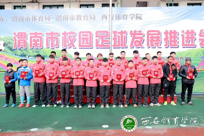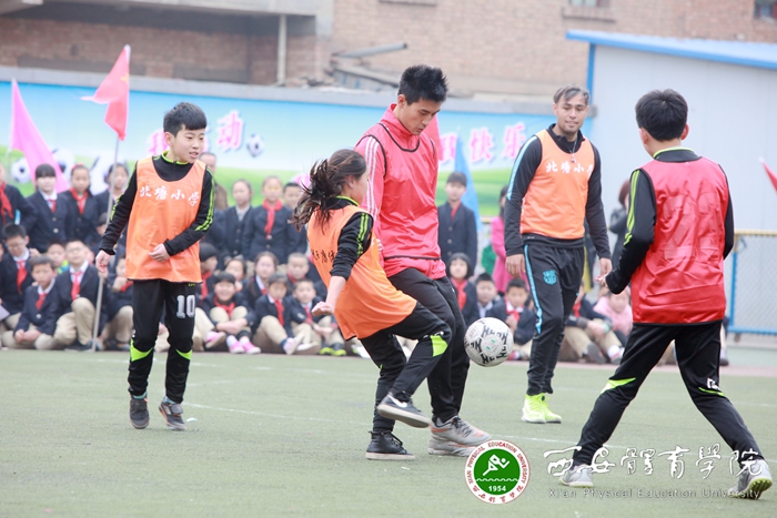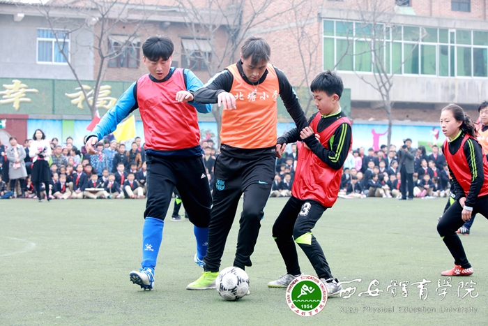 本网讯 3月21日上午,由渭南市体育局、渭南市教育局和我院共同主办,渭南临渭区教育局、北塘实验小学协办的“渭南市校园足球发展推进会”启动仪式在渭南北塘实验小学举行。我院副院长文立新、足球改革发展办公室主任朱军、足球教研室主任唐铁峰、足球教研室教师孙航、胡鑫带领20余名足球专项学生参加了本次活动。