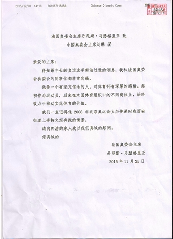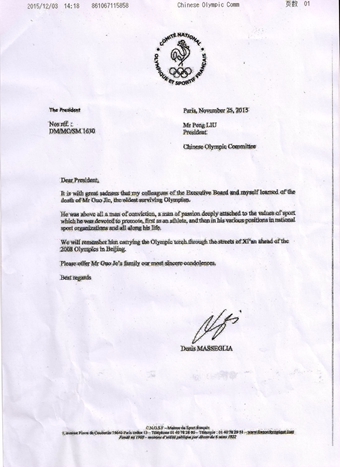 法国奥委会主席丹尼斯·马瑟格里亚表示:得知郭洁教授逝世的消息,他与法国奥委会执委会的同事们都十分悲痛。