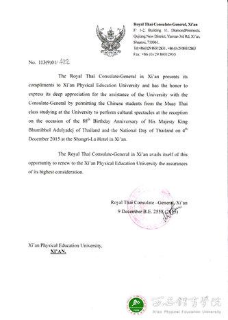 12月4日,泰国驻西安领事馆举办了庆祝泰国国王生日暨泰国国庆日活动,我院学生应邀参加了泰拳艺术表演活动,此次活动圆满成功,泰王国驻西安领事馆专门发来感谢信,表达了对我院的感谢。