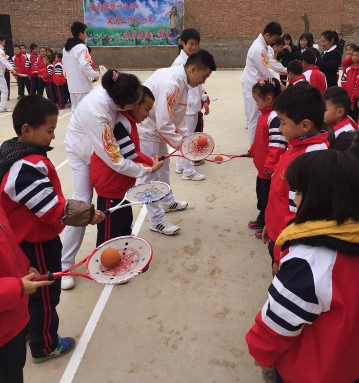 体育与休闲体育系学生和南孟小学的孩子们进行柔力球游戏互动。