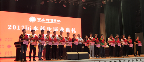 典礼在庄严地国歌声中拉开了序幕。副院长刘新民宣读了《关于授予2017届普通本科毕业生学士学位的决定》,由院长朱元利同志为毕业生代表拨穗并颁发学位证。副院长陈彦宣读《关于2017届院级优秀毕业生的表彰决定》,由全体院领导为院级优秀毕业生代表颁发证书及奖金。接着,党委书记吴长龄同志为赴新疆、西藏边远地区工作毕业生佩戴红花并颁发奖金。来自2017届运动训练系的连磊作为学生代表发言。发言中对领导老师的辛勤培养表示衷心的感谢,也讲出了自己即将走向社会要努力拼搏的志向,字里行间亦流露出对即将离开母校的留恋之情。来自体育教育系的高可心作为在校生代表发言时,对学长学姐的顺利毕业表示衷心的祝贺,感谢学长学姐在校时对低年级学生的帮助,也为即将离开学校步入社会的学长学姐送上了真切的祝福,希望他们能乘风破浪,成为学校的骄傲。来自体育艺术系的教师代表魏明涛致辞时为毕业生送上祝福,在热烈的掌声中,魏老师回忆了学生匆匆逝去的四年时光,也希望他们能放飞梦想,大胆的去追求属于自己的美好明天。健康科学系毕业生家长代表张小娟女士致辞时,为毕业生悉心叮嘱,不管毕业后走到哪里都要不忘师恩,不忘母校。在致辞结尾她为毕业生送上了自己的祝福,也代表家长们对西安体育学院给予孩子们的培养表示感谢。