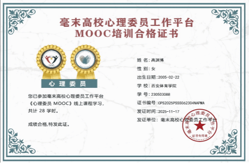 采用集中线下培训+线上MOOC课程相结合的方式,开展两期班级心理委员能力提升训练营,首批90名学生全部取得高校心理委员MOOC培训合格证书,选聘优秀心理委员代表参加第二届陕西高校班级心理委员成长训练营培训活动。