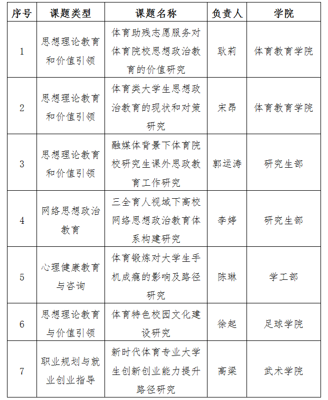根据《中共西安体育学院党委学生工作部关于申报2024年度学生工作专项研究课题和精品项目的通知》的要求,各二级学院积极组织,广泛发动,共上报学生工作精品项目2项,研究课题7项,具体名单如下: