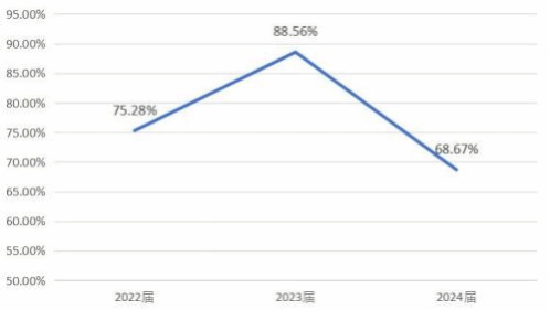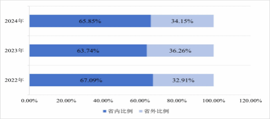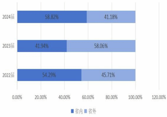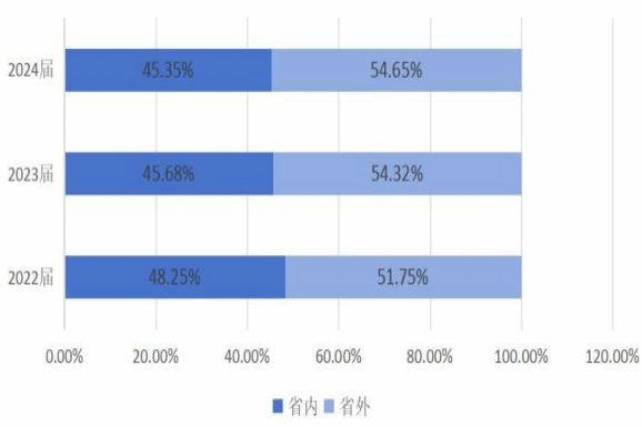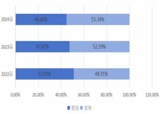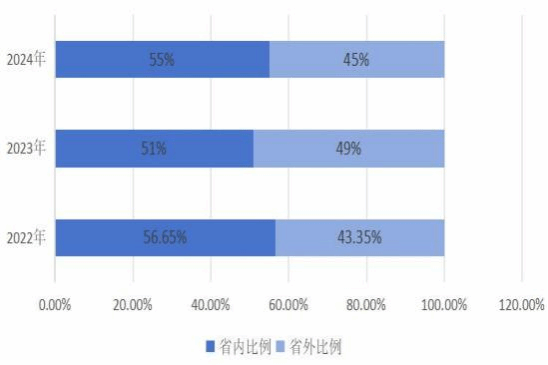 业。2022年省外就业比例为43.35%2023年上升至49%2024年又降45%。呈现先上升后下降的趋势,与省内就业比例的变化趋势相反。