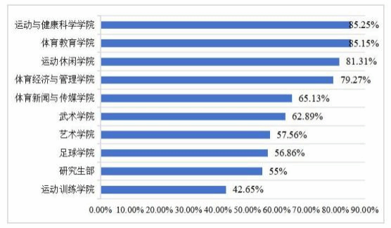 学校2024届本科毕业生分布在9个学院,其中毕业生人数占比位居前三位的分别为运动训练学院(494人、19.90%)、体育教学学院463人、18.65%)、艺术学院(270人、10.88%)。研究生部毕业生人数为415人, 占毕业生总体的16.72% 。各学院具体毕业生人数分布详见下表1-1