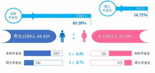 从性别结构来看,男生1599人(64.42%),女生883人(35.58%),男女性别比为1:0.55 。分学历层次来看,其中本科毕业生男女性别比
