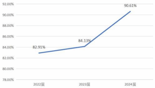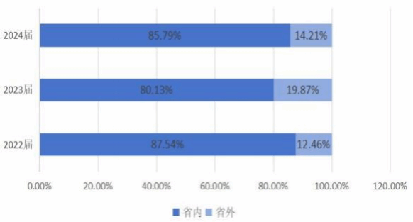整体来看,省内和省外就业比例差距在缩小。2022年两者相差13.3% 2023年相差2% 2024年相差10% 。这反映出毕业生就业地域选择更加多元化。