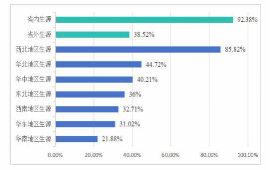 学校2024届毕业生生源涵盖30个省市(自治区),其中以省内生源为主,占毕业生总人数的46.05%;省外生源主要来自山西省、山东省以及河南省。