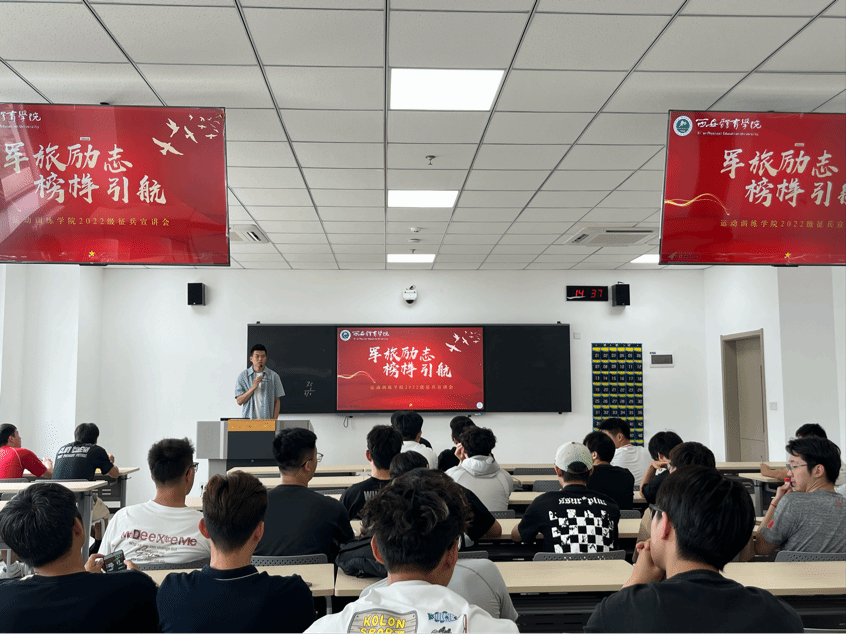 为激励运动训练学院2022级学生投身国防、逐梦军旅,明晰征兵政策6月18日下午14:30,运动训练学院2022级于教学楼307教室开展“军旅励志,榜样引航”征兵宣讲会,以榜样力量点燃青春报国热忱,运动训练学院2022级负责人李丹,辅导员吴奇以及有意向参军入伍的学生参会。