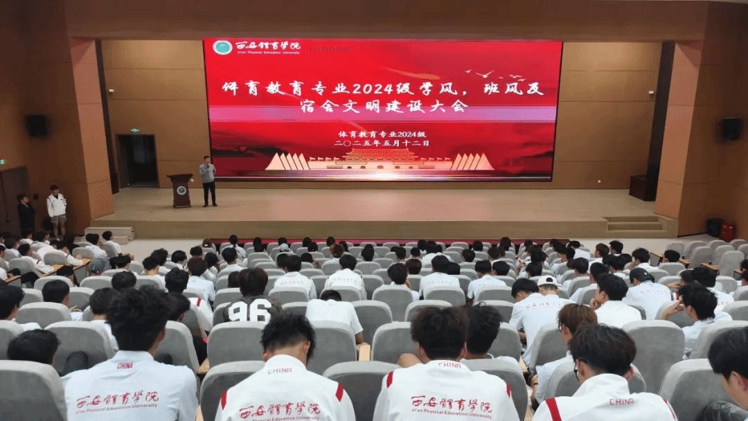 为贯彻落实立德树人根本任务,体育教育专业2024级于5月12日晚在西安体育学院教学楼报告厅召开学风、班风及宿舍文明建设专题会议。会议由体育教育专业2024级辅导员管融资、袁景峰主持,体育教育专业2024级全体学生参加。