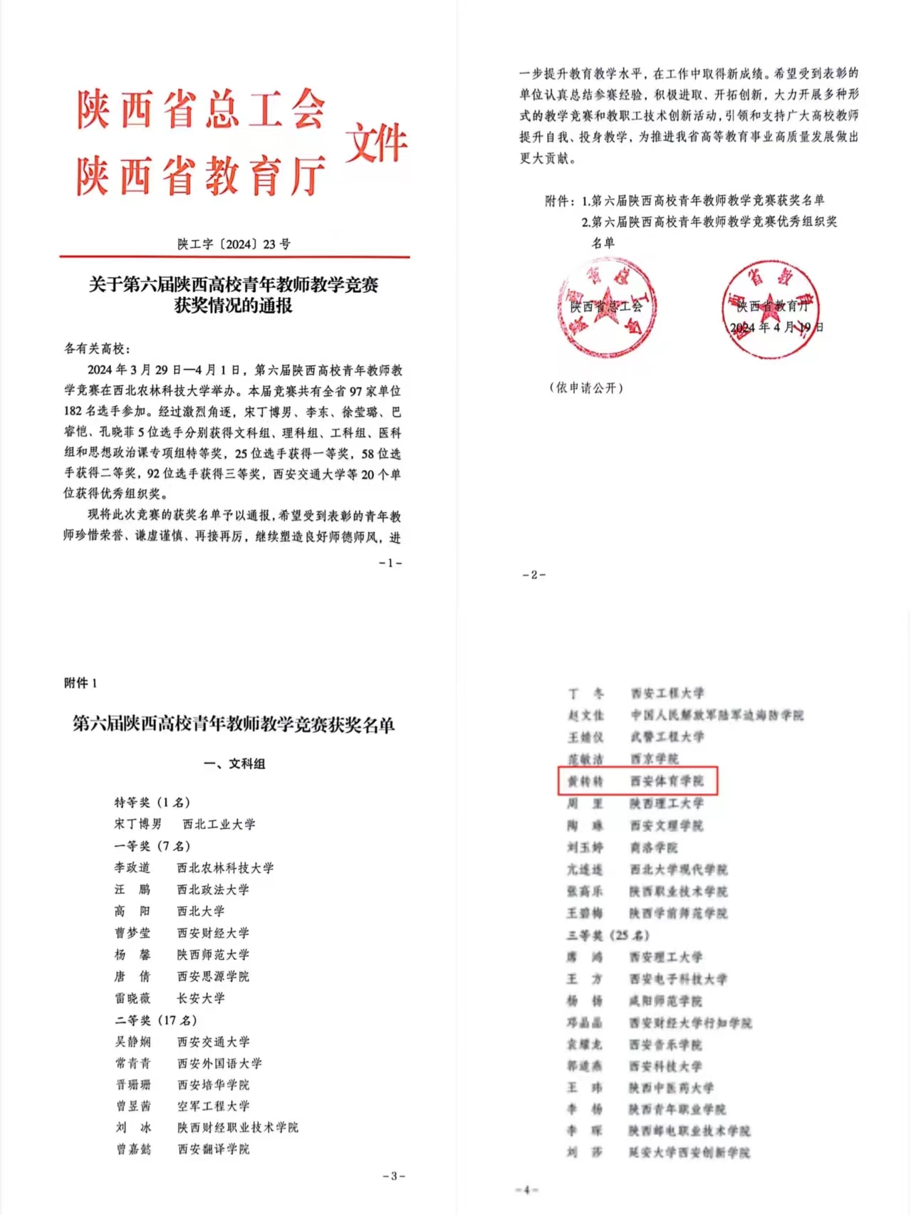 3月30日至4月1日,由陕西省总工会、陕西省教育厅主办的第六届陕西高校青年教师教学竞赛在西北农林科技大学成功举办。经过3天的激烈角逐,我院青年教师黄转转最终凭借扎实的教学基本功、优秀的专业素养创造佳绩,荣获文科组二等奖,其精彩表现充分展现了我院青年教师扎实的教学能力和厚实的专业素养。