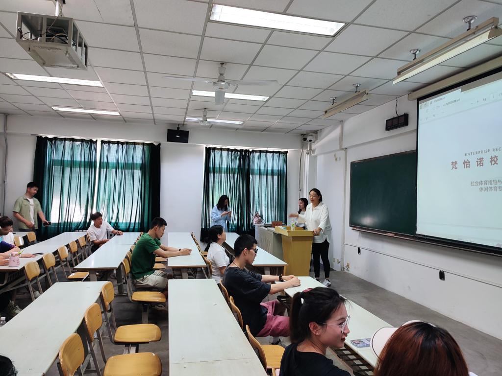 2024年5月10日15:50运动休闲学院召开了企业推介及精准招聘会,党总支书记郭春玲,梵怡诺瑜伽健身馆总经理叶青,学工办主任陈楚乔出席参加。