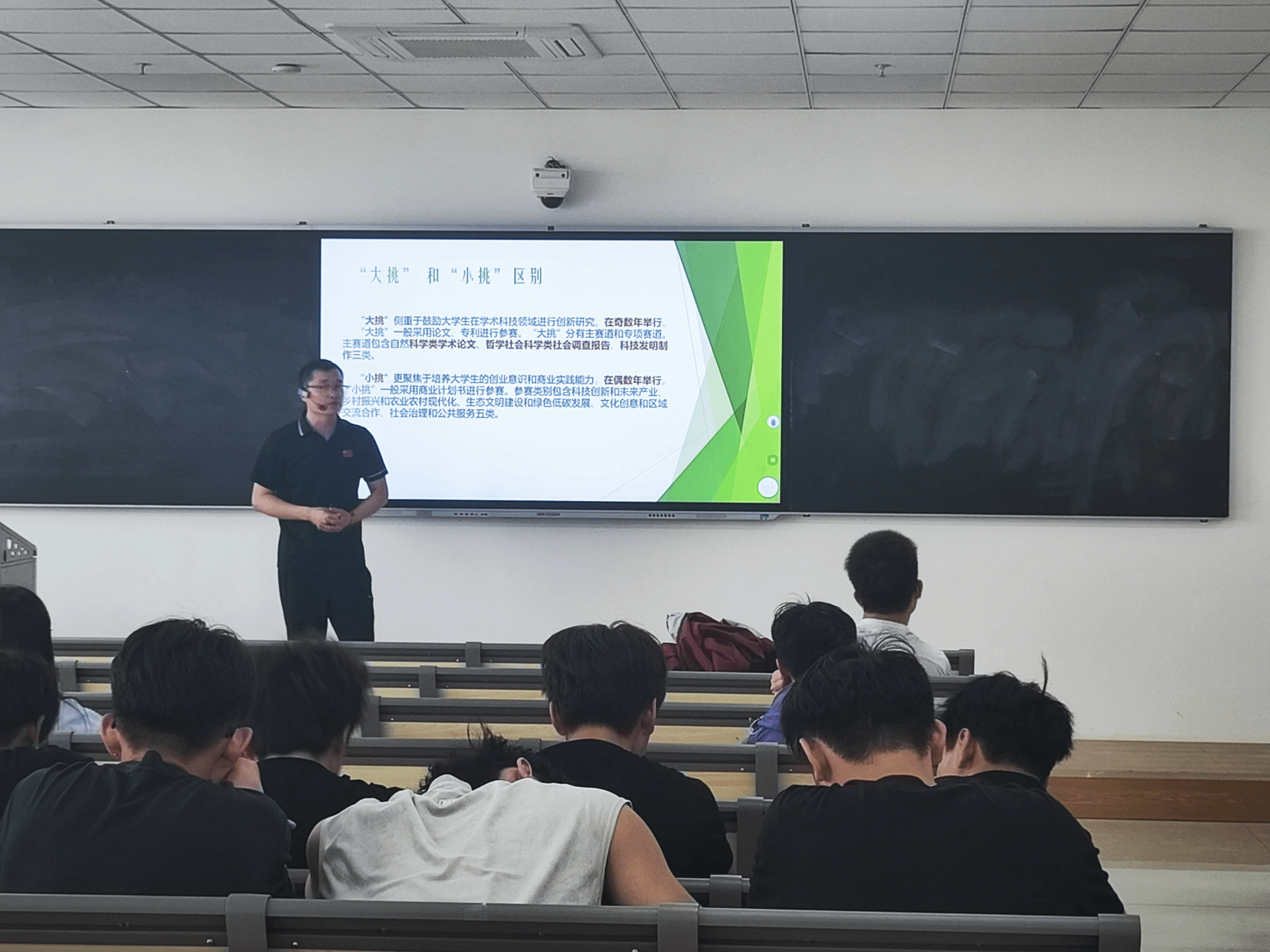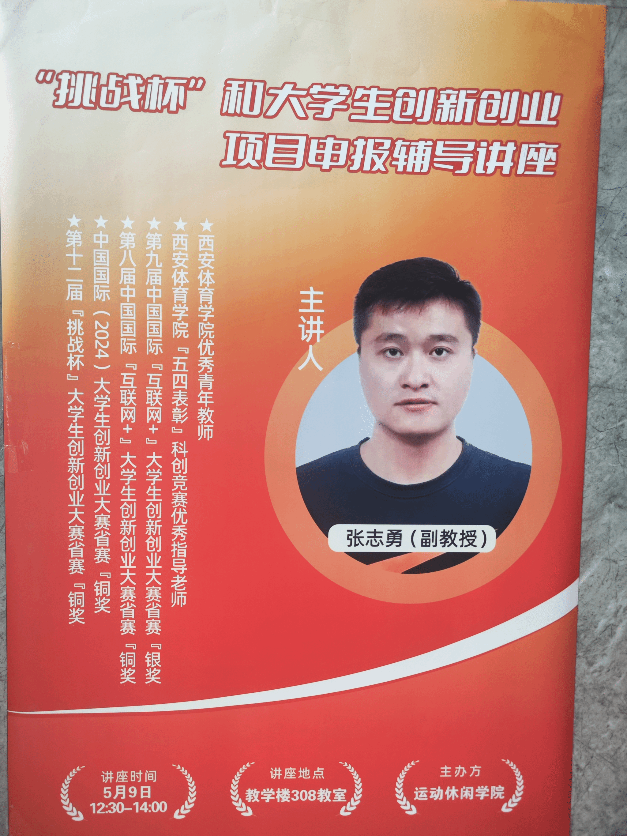 2025年5月9日12:30,运动休闲学院在教学楼308教室开展“挑战杯”大学生创新创业项目申报专题辅导讲座。本次活动特邀西安体育学院副教授、科创竞赛资深导师张志勇担任主讲,近百名学生到场聆听,现场学习氛围热烈。