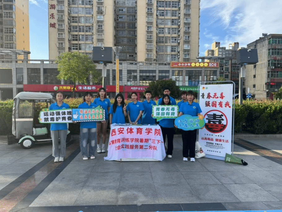 鄠邑区人民广场的中央,一串 “青春无毒,强国有我” 的宣传立牌在风里招展。夕阳将西安体育学院体育教育训练学院暑期“三下乡”社会实践服务第二分队桌子染成暖金色,夕阳将西安体育学院实践队的蓝色帐篷染成暖金色,余晖中,仍有不少结束一天忙碌、来赶晚市的居民围聚于此。