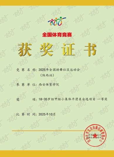 此次获奖是西安体育学院排舞队继陕西省排舞公开赛后取得的又一佳绩,充分体现了学校在体艺融合育人方面的扎实成效,也是体育教育训练学院践行“以赛育人”理念,将竞技实践融入专业教学、提升学生综合能力的生动写照。队员们表示,将以此次荣誉为新起点,积极推动排舞运动在校园内的普及与发展,努力成长为德智体美劳全面发展的高素质体育人才,为陕西省乃至全国排舞事业的高质量发展注入新的活力。