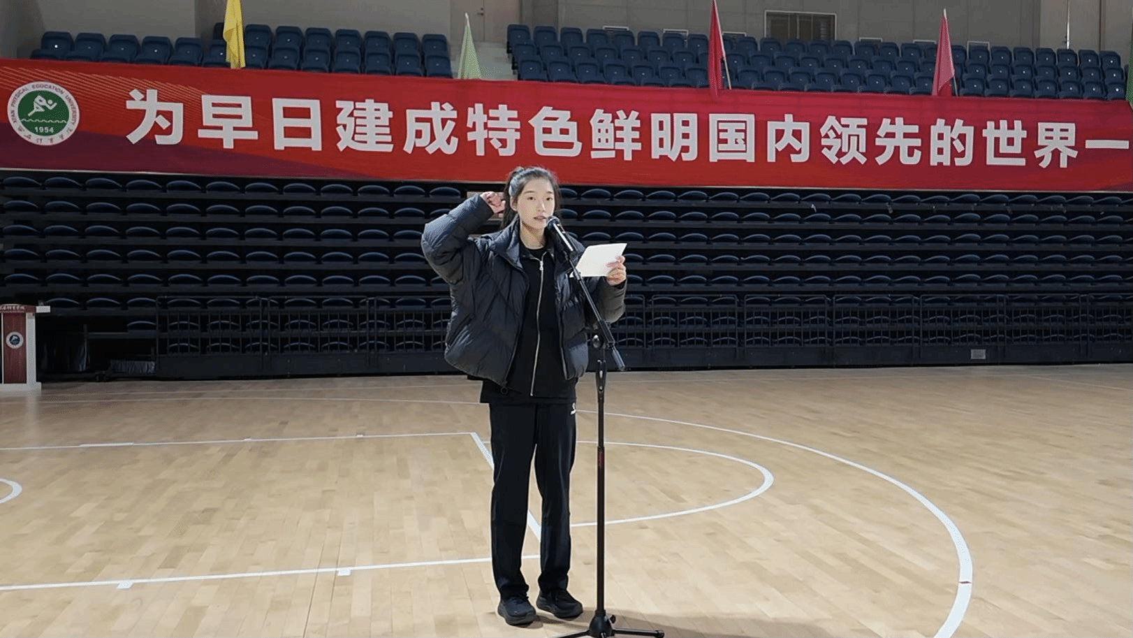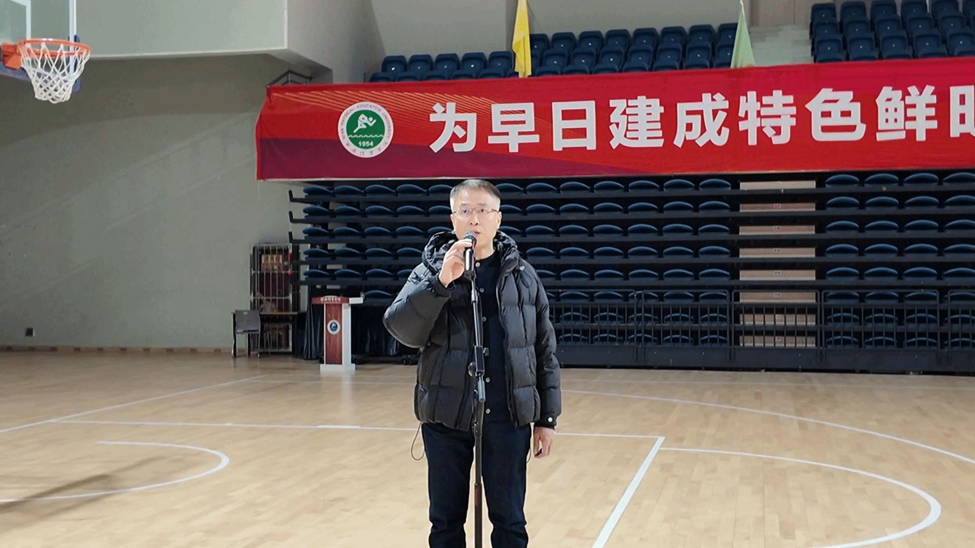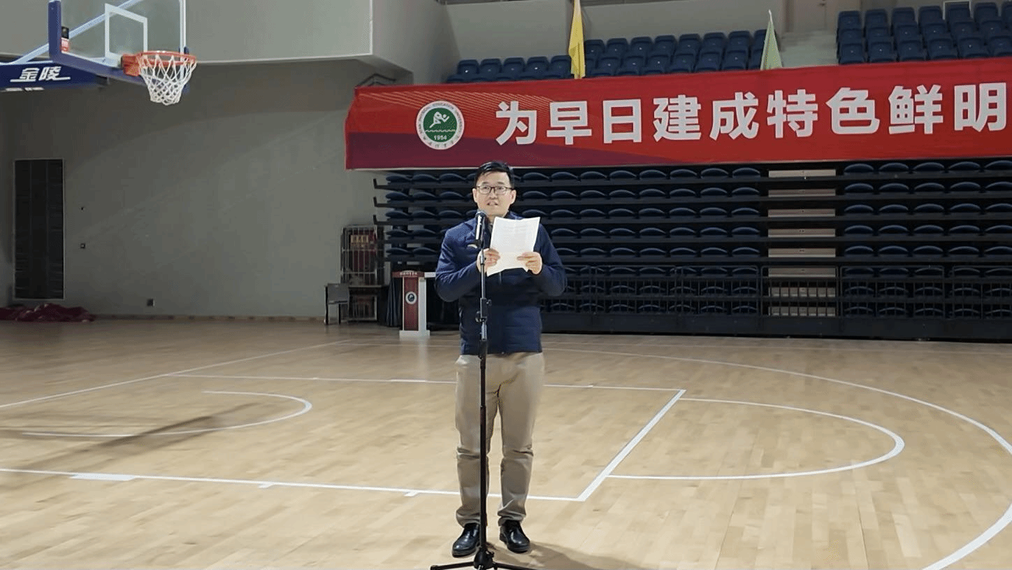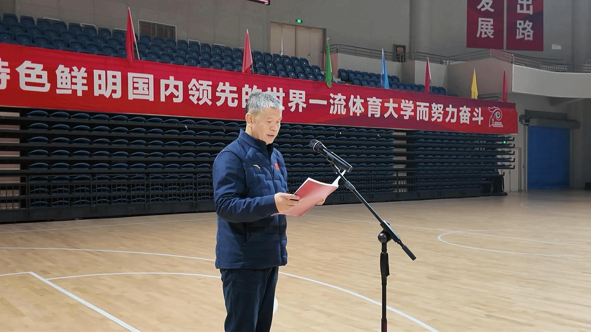 随后,学院副院长武洛生为开幕式致开幕词。特别指出本次“贺岁杯”篮球赛旨在落实国家三大球振兴发展战略,通过以赛促练、以赛促学,为同学们搭建锤炼专业技能、深化交流协作的平台,助力大家在比赛中提升组织、执裁、媒体宣传等综合能力,成长为一专多能的复合型高素质体育人才。期望全体参赛选手,要将赛场上的拼搏精神、协作意识融入学习生活,以强健体魄、昂扬斗志迎接新一年的挑战;希望运动员们秉承“友谊第一、比赛第二”的体育精神,赛出风格、赛出水平,裁判员坚守公平公正原则履职尽责,工作人员恪尽职守保障赛事运行,观众文明观赛、热情助威。